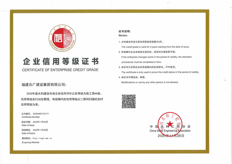 • 福建合廣建設集團有限公司2020年費水利工程質量月榮譽證書